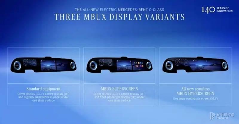 全新纯电C级轿车内部搭载39.1英寸(99.3厘米)的无缝MBUX超联屏,其采用创新的矩阵背光技术,基于超1,000颗独立的LED,可分区独立调节亮度,既能为驾驶者提供清晰的信息,又能兼顾前排乘客的个性化娱乐体验。车机屏幕的迎宾动画将车外复古盾格式格栅和尾灯营造的情感共鸣融入车内,配合整体式音效系统的专属音效,从外到内营造出和谐统一的仪式感。